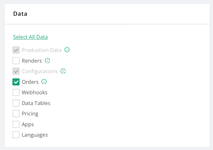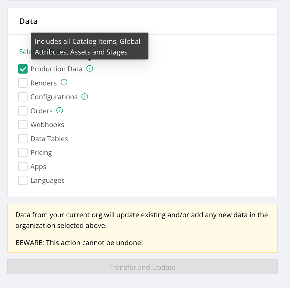 Dependencies will automatically be selected. For example, transferring Orders requires transferring Production Data and Configurations.