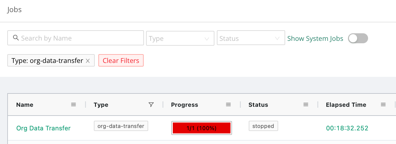 If a Data Transfer is initiated successfully, you will see a record of it in the Jobs page: