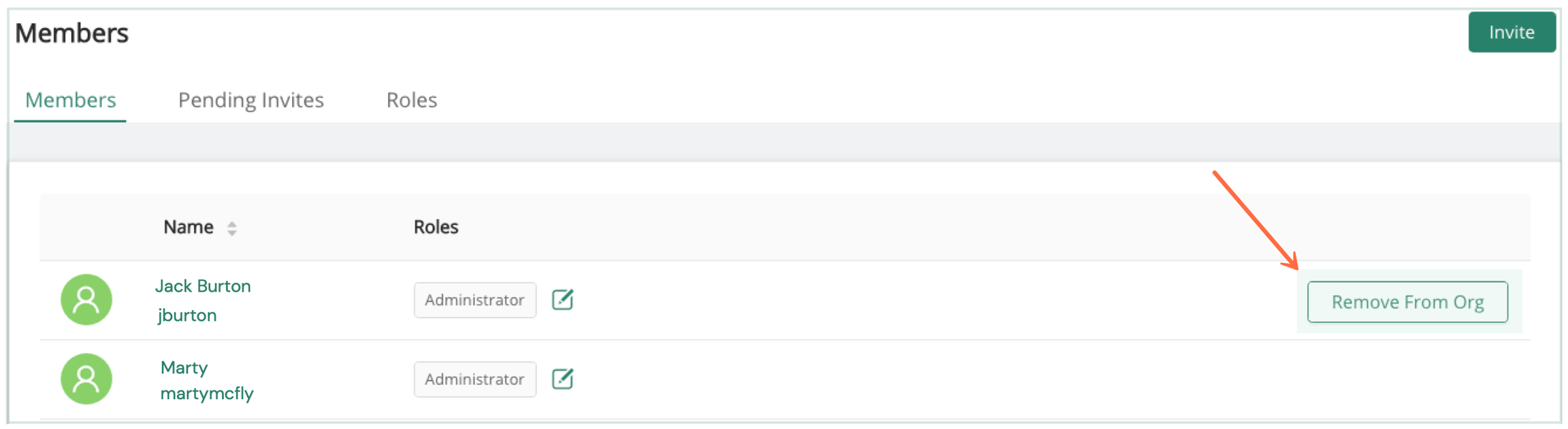 A member can be deleted by hitting the Remove From Org button.