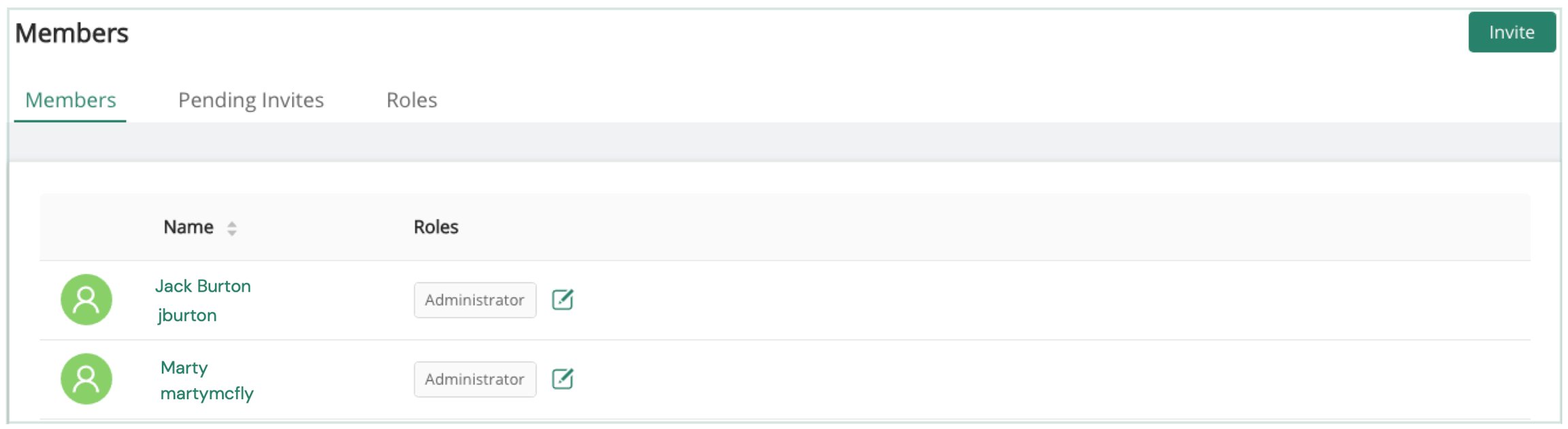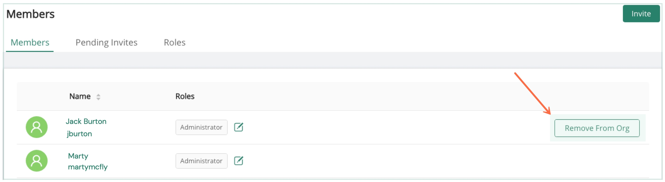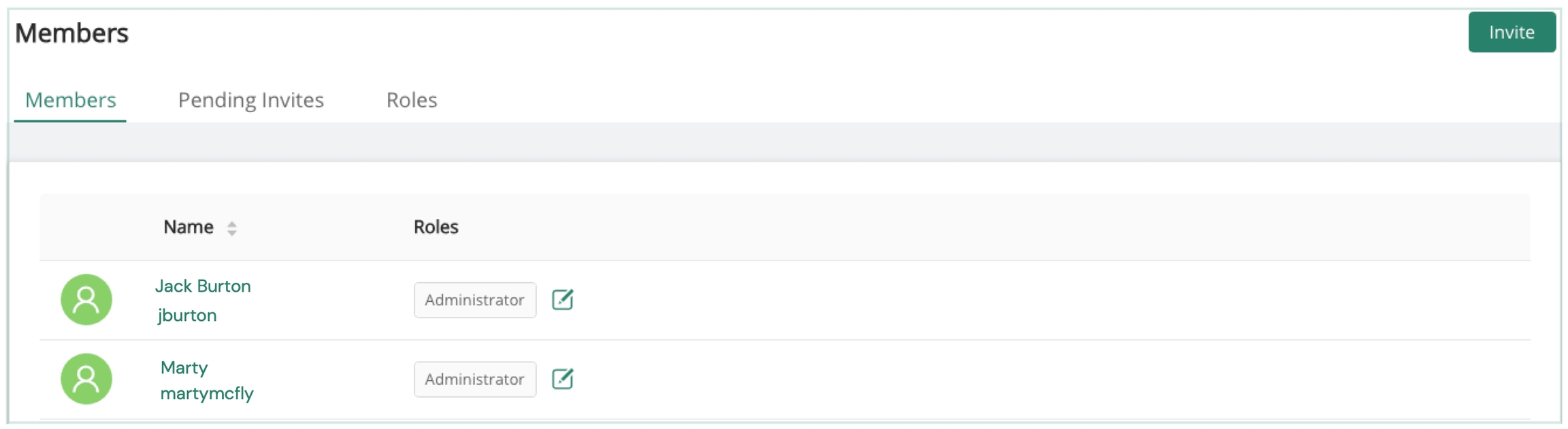 The Members tab provides information on present members of the Organization. Members may be added and deleted as necessary; outbound invites may be tracked as necessary.