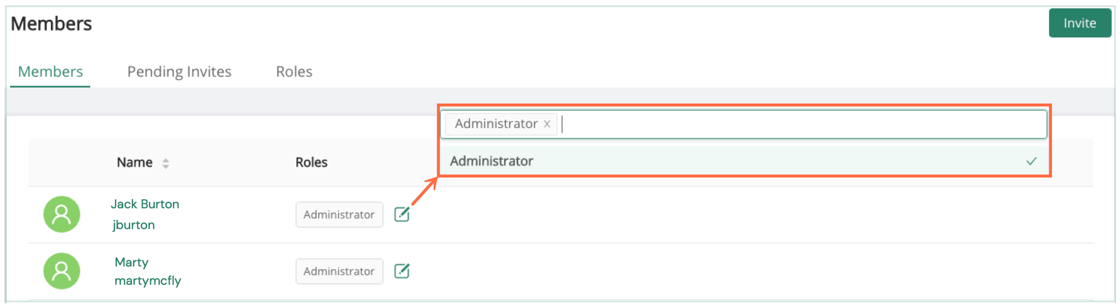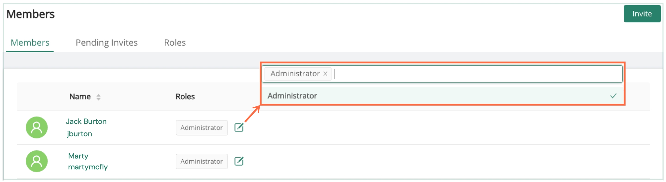 Roles are assigned once the user is an org member. This is accomplished by way of the user menu on the Members page.