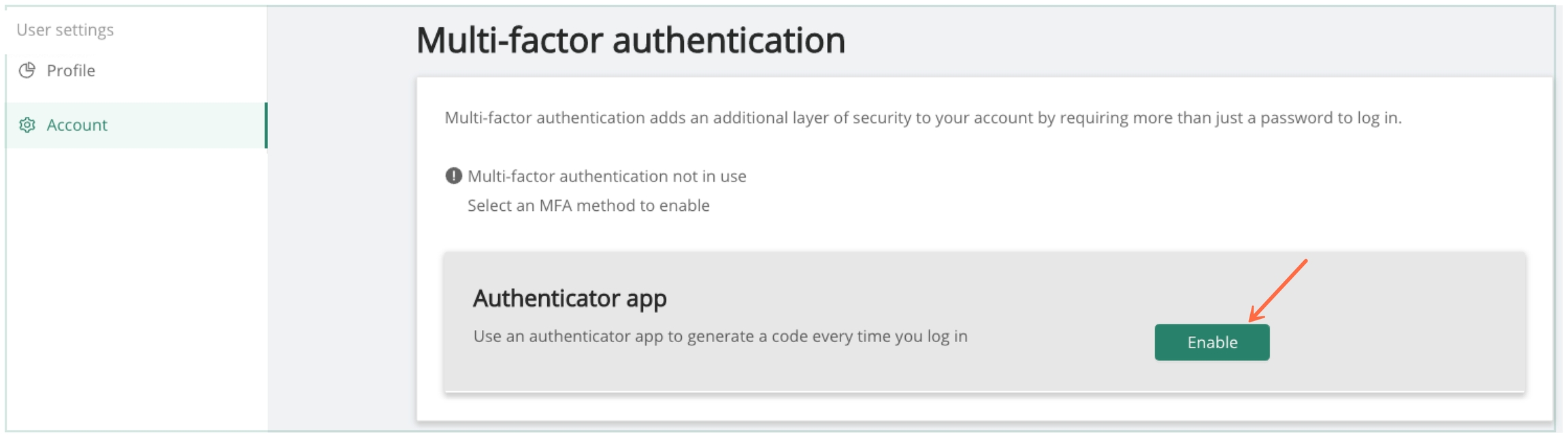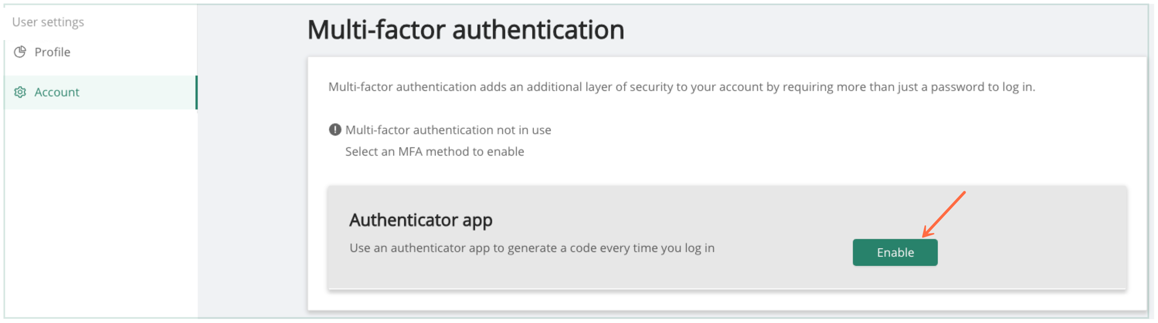 From the account tab, the user has the ability to enable multi-factor authentication. From account tab, hit Enable