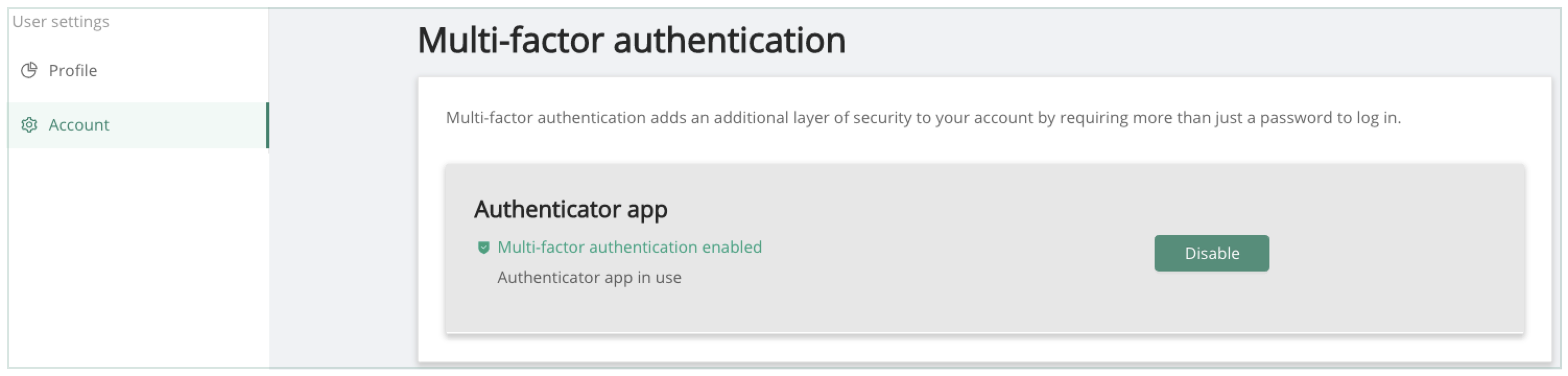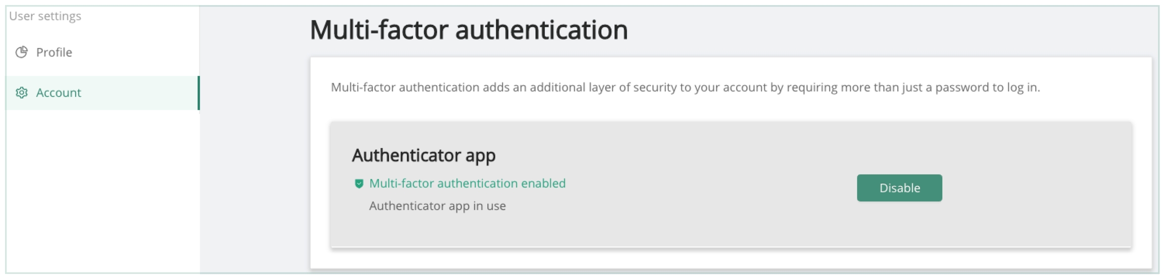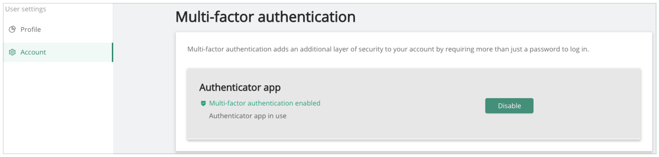 Once enabled, multi-factor can be disabled by hitting the Disable button.