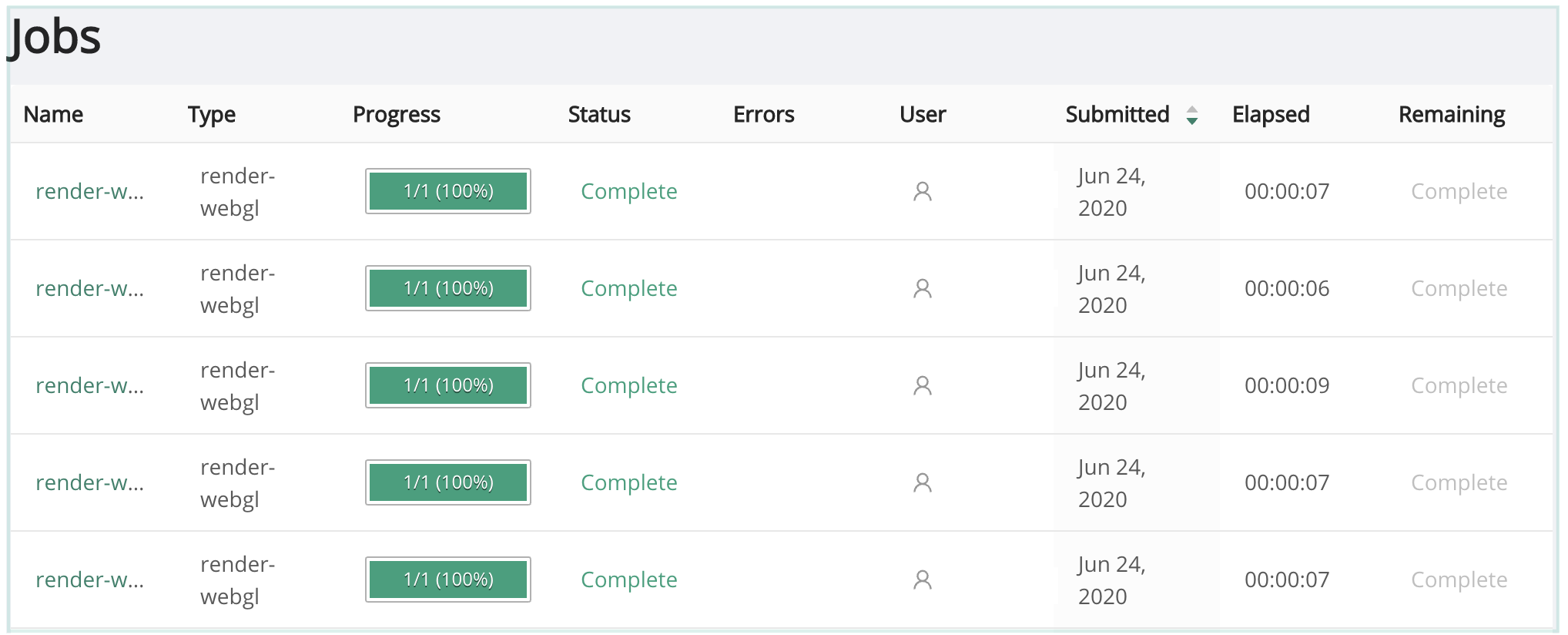 The jobs listing, accessible via the Jobs tab under the Org Settings, retains record of every import, export, and render, as well as respective status.<br>