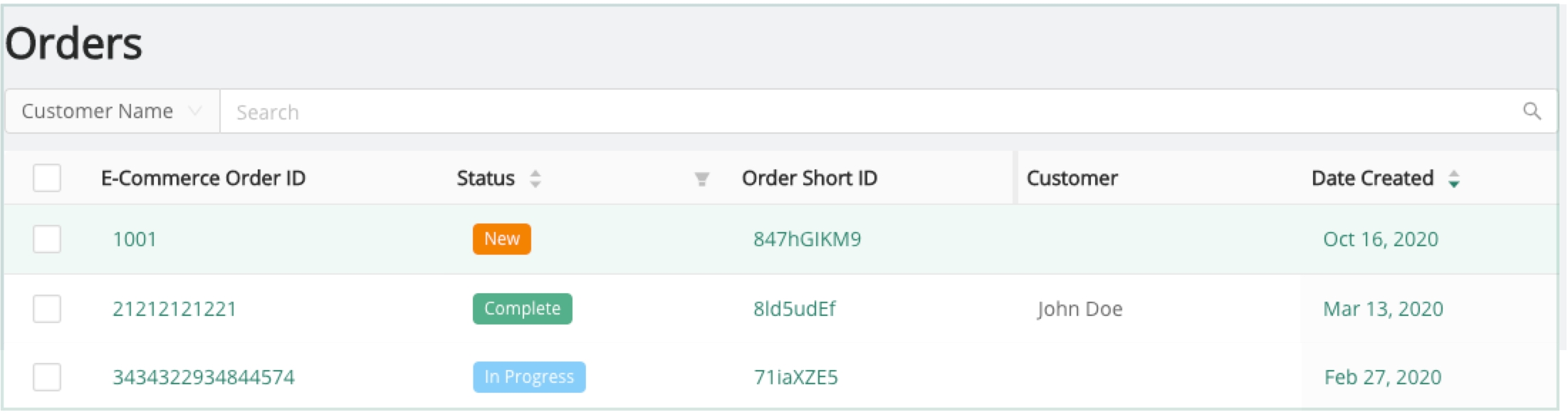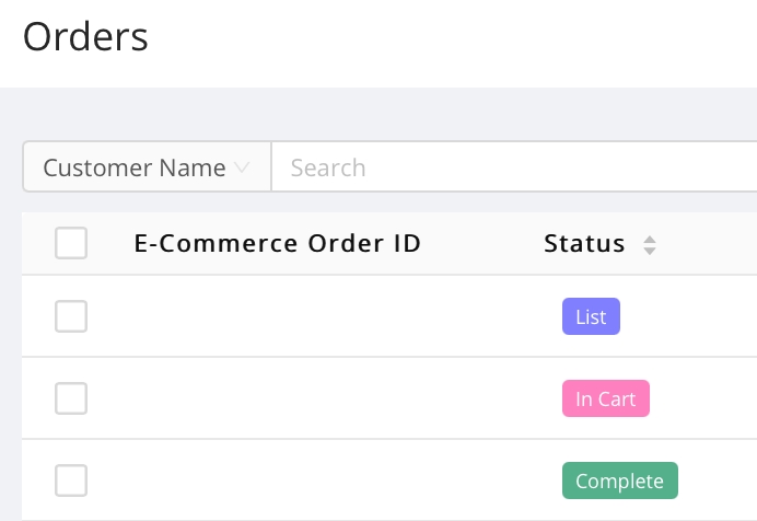 The Orders tab allows for visibility on placed orders from an eCommerce system. Information is presented in a tabular format, sortable by Date and Status.