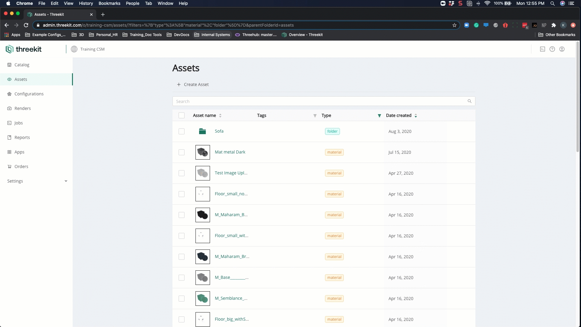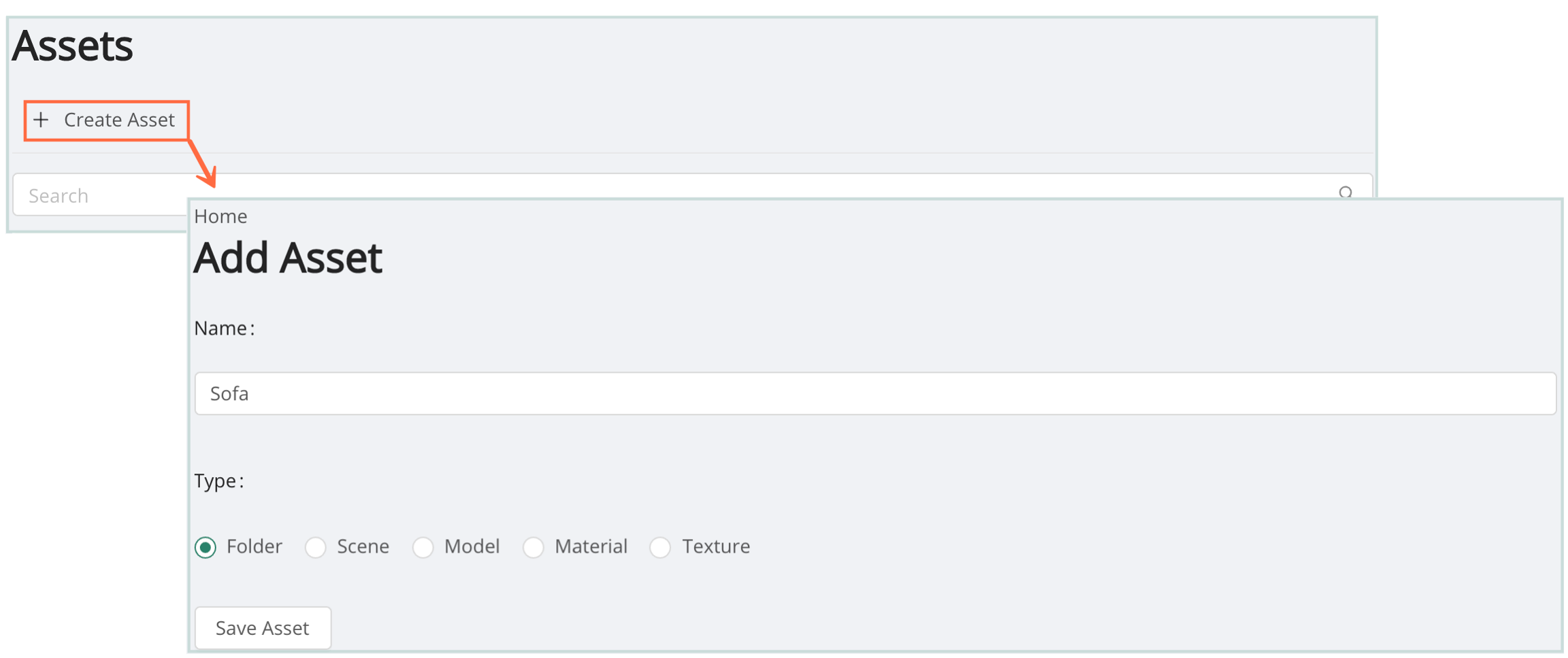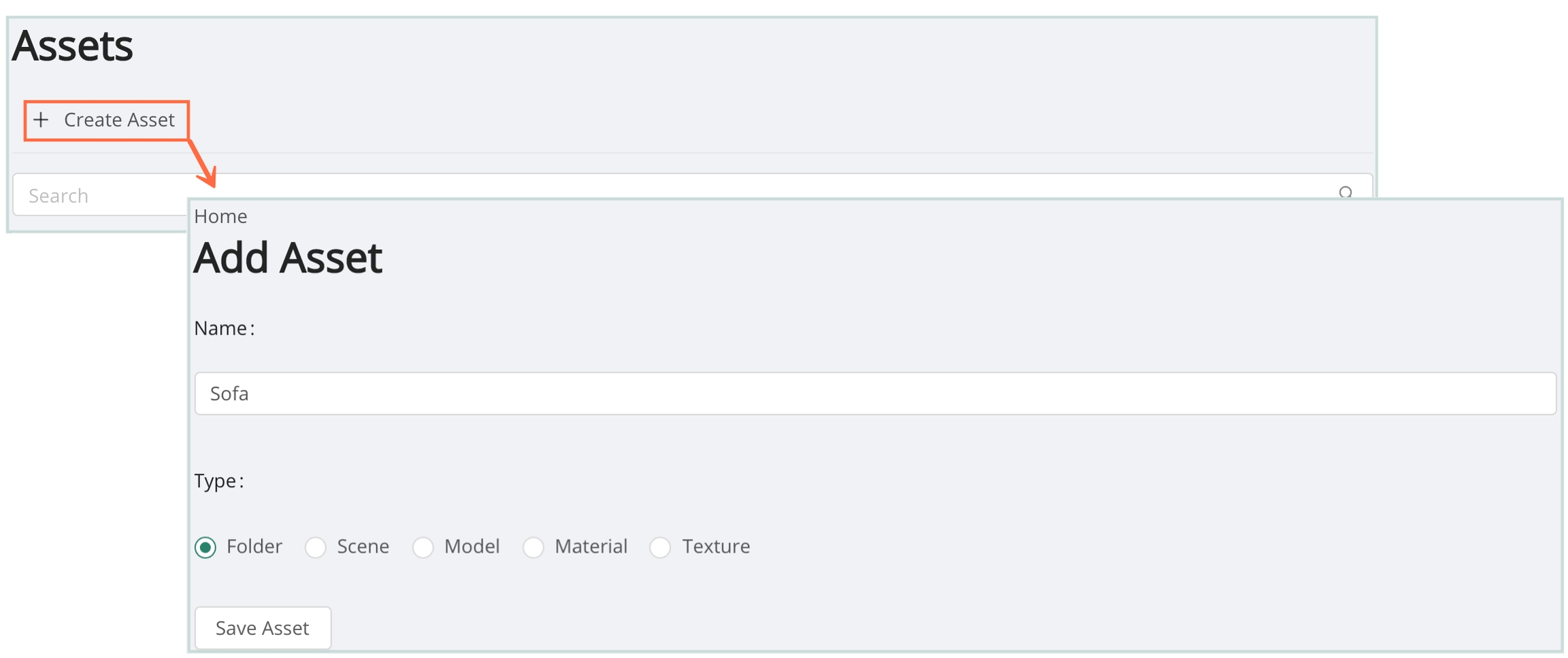 Organizing assets into folders is quick and easy. Add a folder by way of the + Create Asset button