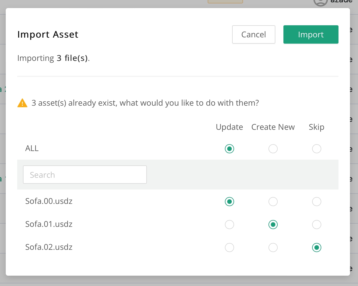 By default, importing an asset will check for existing assets with the same name in the current folder on the platform, and update that asset if it already exists. It will only create a new asset if no other assets exist in the current folder with that file name.