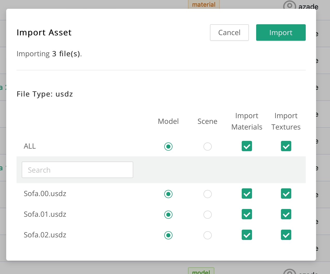 Uploading ZIP files will not show an import dialog box. The contents will get automatically uploaded to ThreeKit.