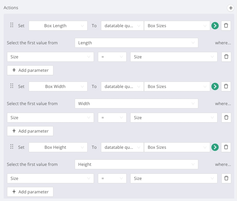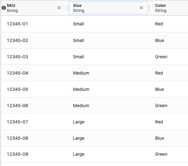 i. Add Each Size from the first column of the data table as an option for selection, be careful to match spelling and capitalization.