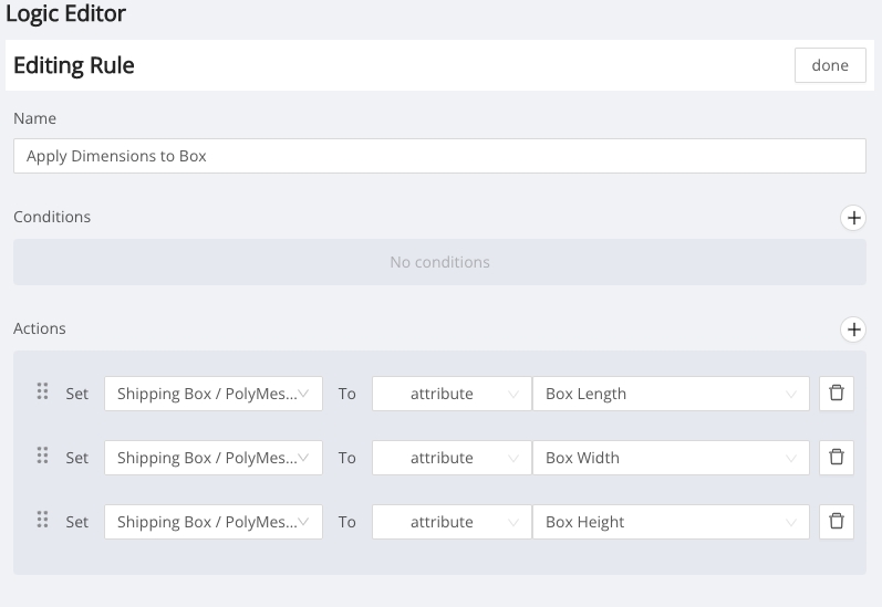 These rules allow the asset to automatically change size based on selection of the Size attribute by looking up the proper dimensions in the data table!