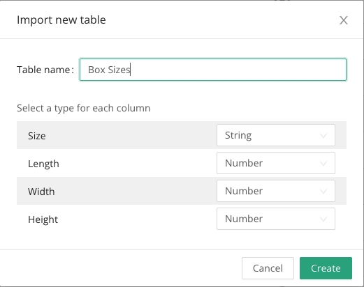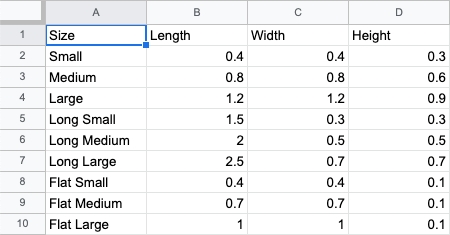 Try it yourself by adding a new size “Refrigerator” (Length: 1, Width: 0.75, Height: 2) to see how easy it is to maintain!