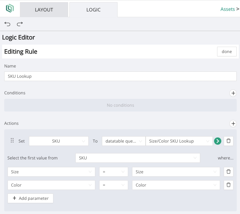 Note when creating logic rules, the Data Table search parameters are always utilizing AND logic in their search. So, the above example searches for the first row in the SKU data table that matches [Size (column in table) = Size (attribute on asset)] AND [Color (column in table) = Color (attribute on asset)].