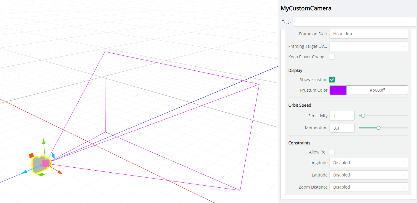 Setting this Boolean to true makes visible the Camera's frustum. This exposes a color picker to adjust the color of the Frustum as well as a Boolean to show the near and far clip of the camera.