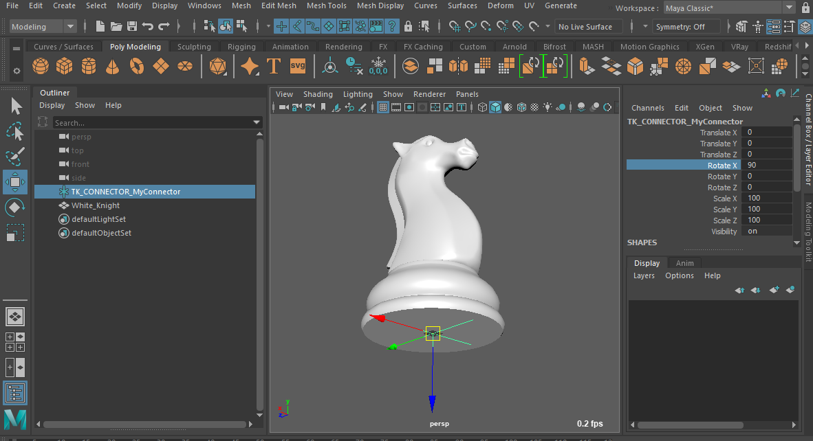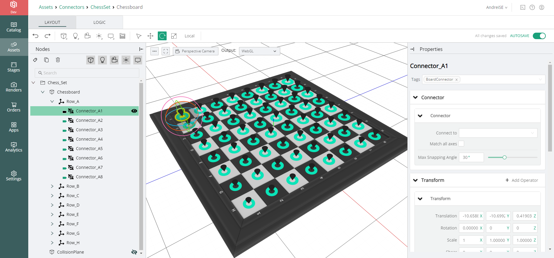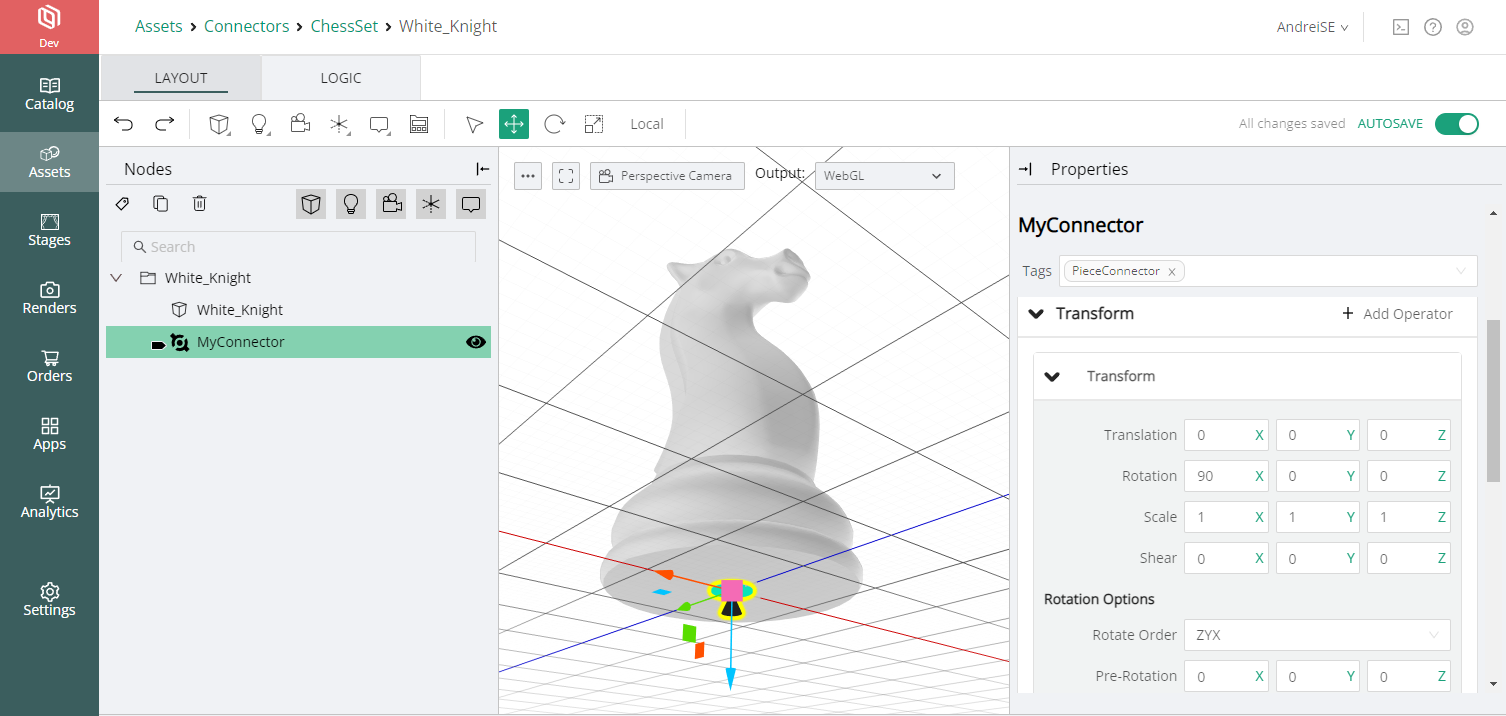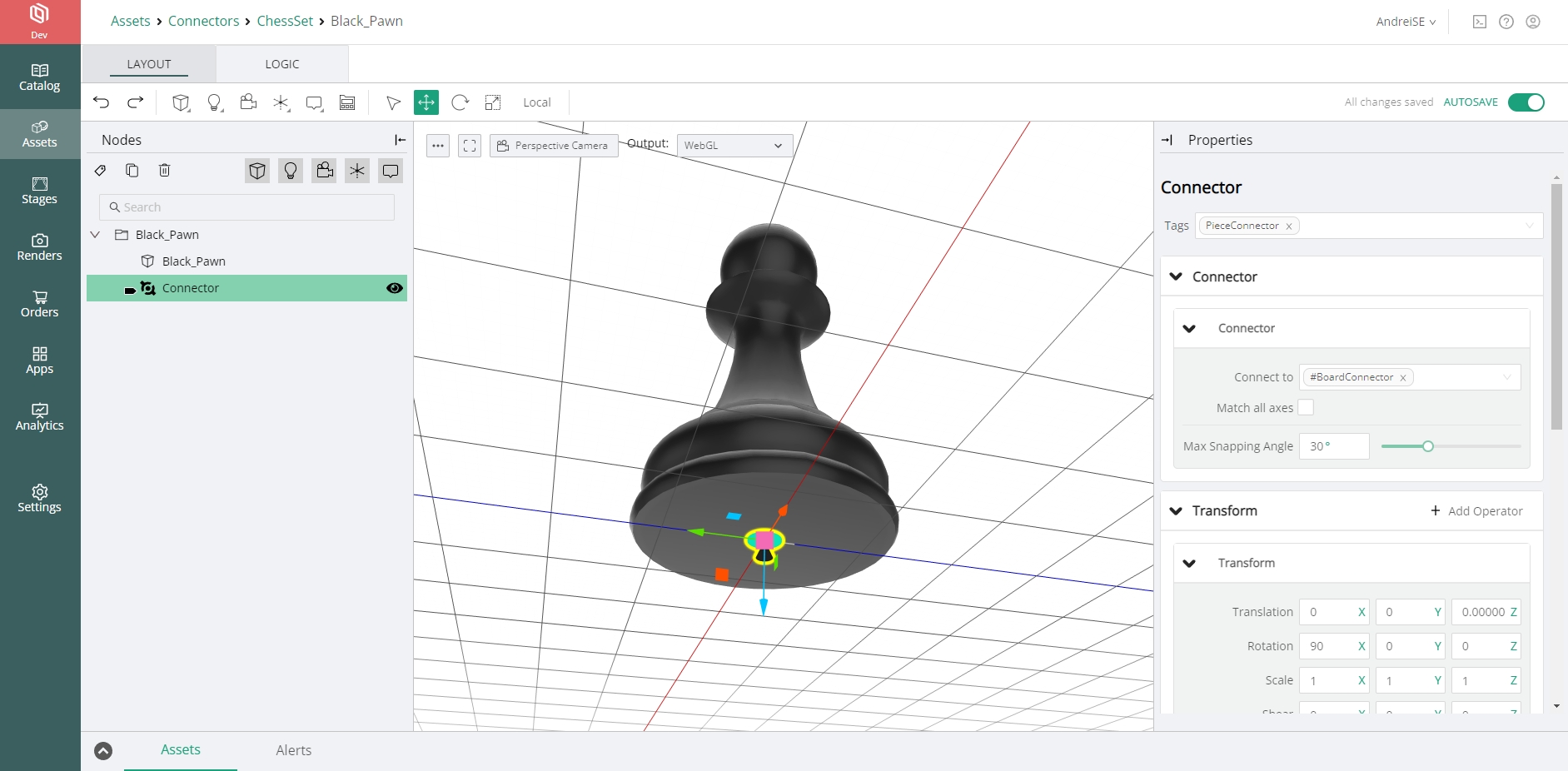 Inside the Pawn and Knight Models, we would need to add a Connector node, which needs to be tagged with the tag #PieceConnector. The Connect to target for this node would then be the #BoardConnector. This ensures that chess pieces would not snap to each other.