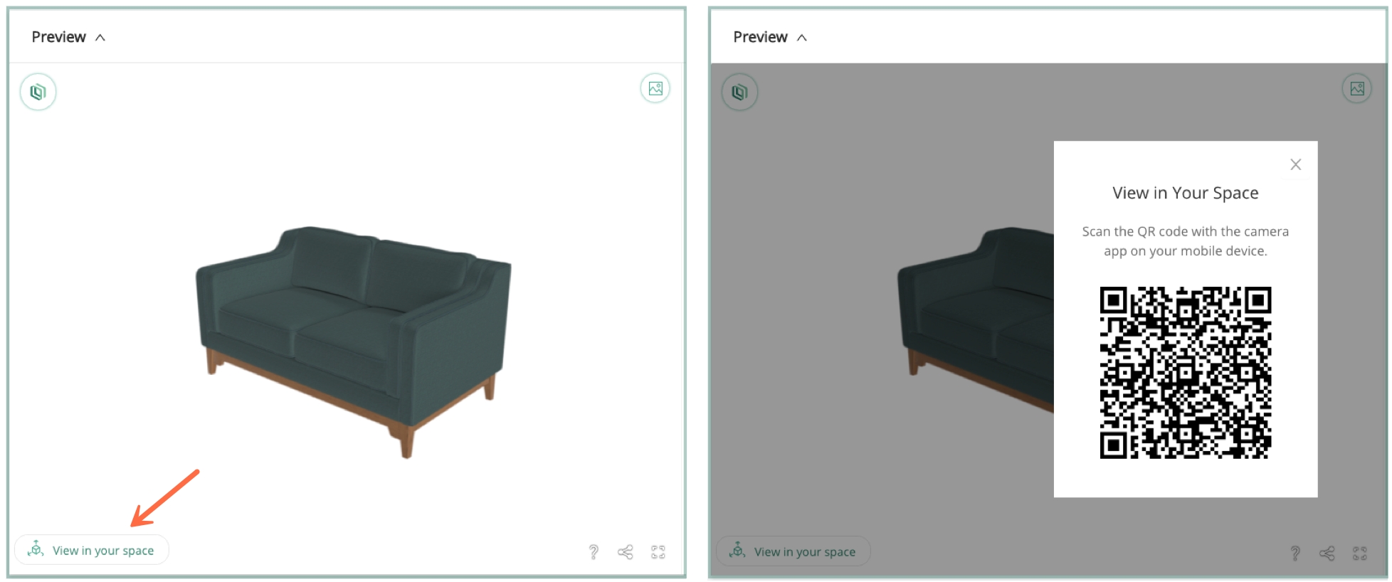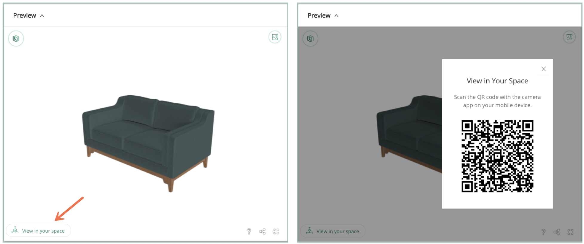 Desktop to Mobile AR is also available, via the "View in your space" button. Simply press the button and scan the QR code to view the item in your space.