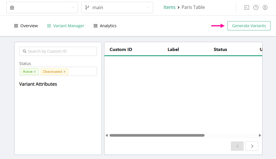 The Item Variants can be generated by clicking on the Generate Variants button at the top right of the Variant Manager page.