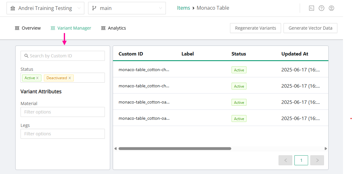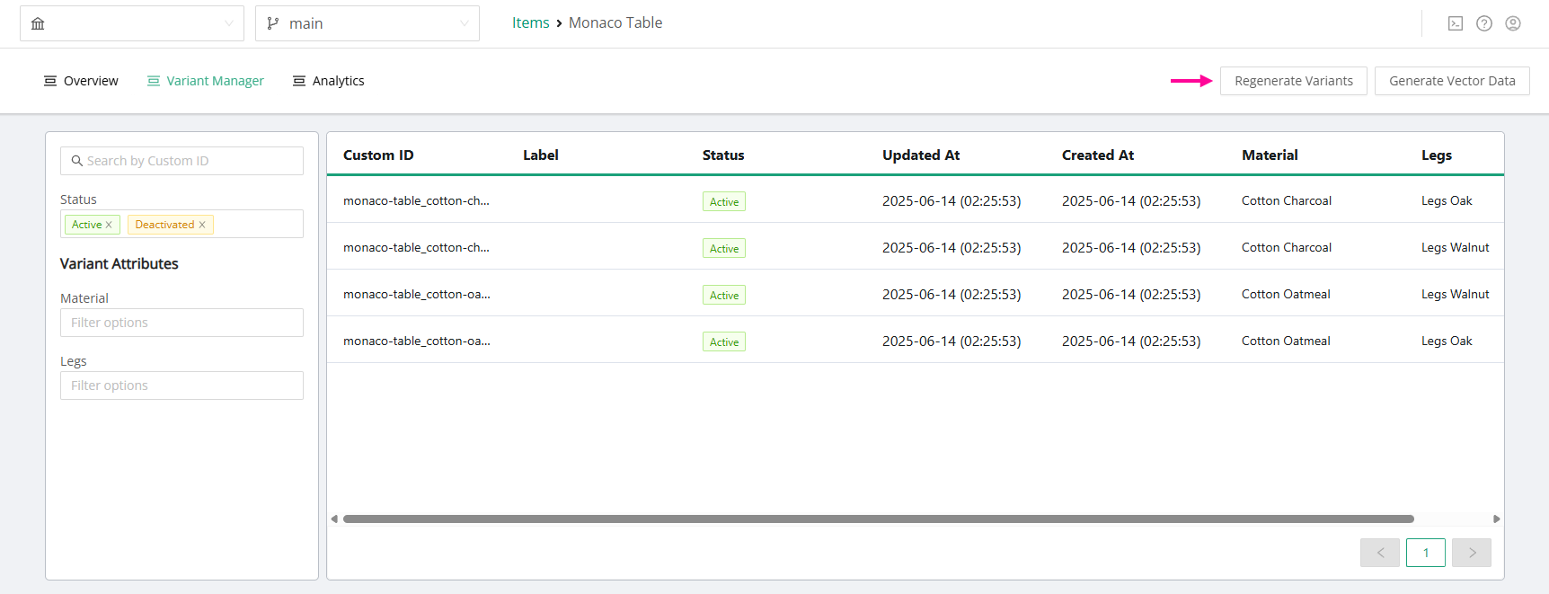 The button to generate the vector data is available on the top right of the Variants listing page.