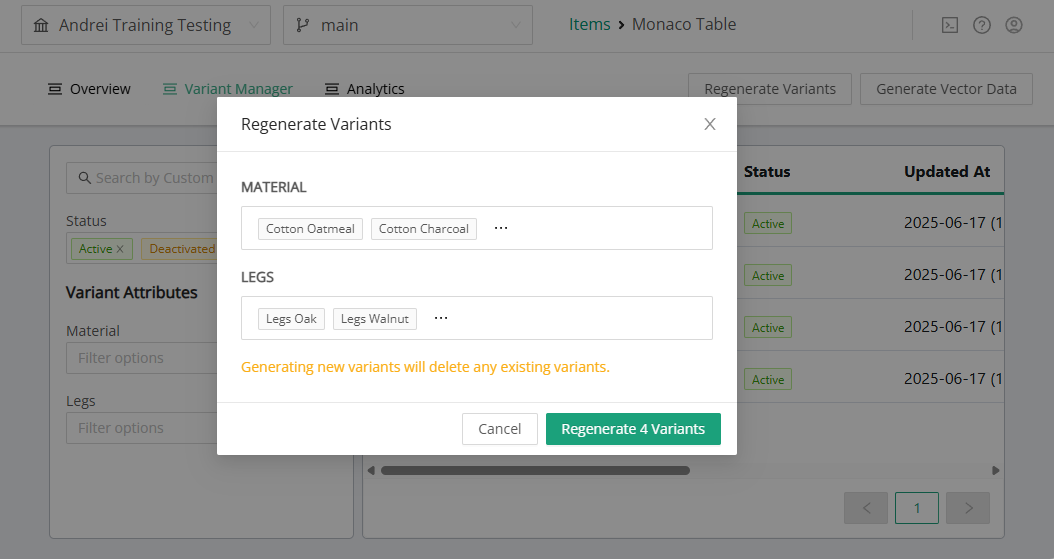 Once changes are made to the item configuration, the variants will need to be re-generated.