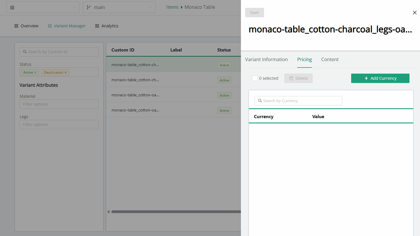 Set the status of the Variant to either Active, Deactivated, or Invalid. These states define whether the Variant should be used in the front-end UI, or whether it is a valid combination of options altogether.