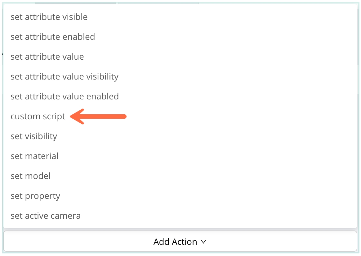 While using the out-of-the-box toolset when creating configurators is encouraged, it is occasionally necessary to make use of custom scripts. Custom scripts may be added in the same manner as any other visual action, via the action drop down on a rule.