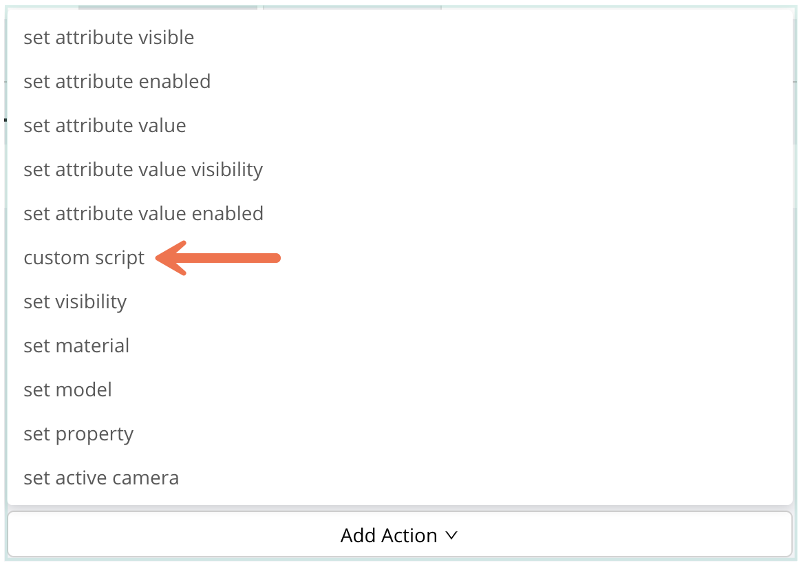 While using the out-of-the-box toolset when creating configurators is encouraged, it is occasionally necessary to make use of custom scripts. Custom scripts may be added in the same manner as any other visual action, via the action drop down on a rule.<br>