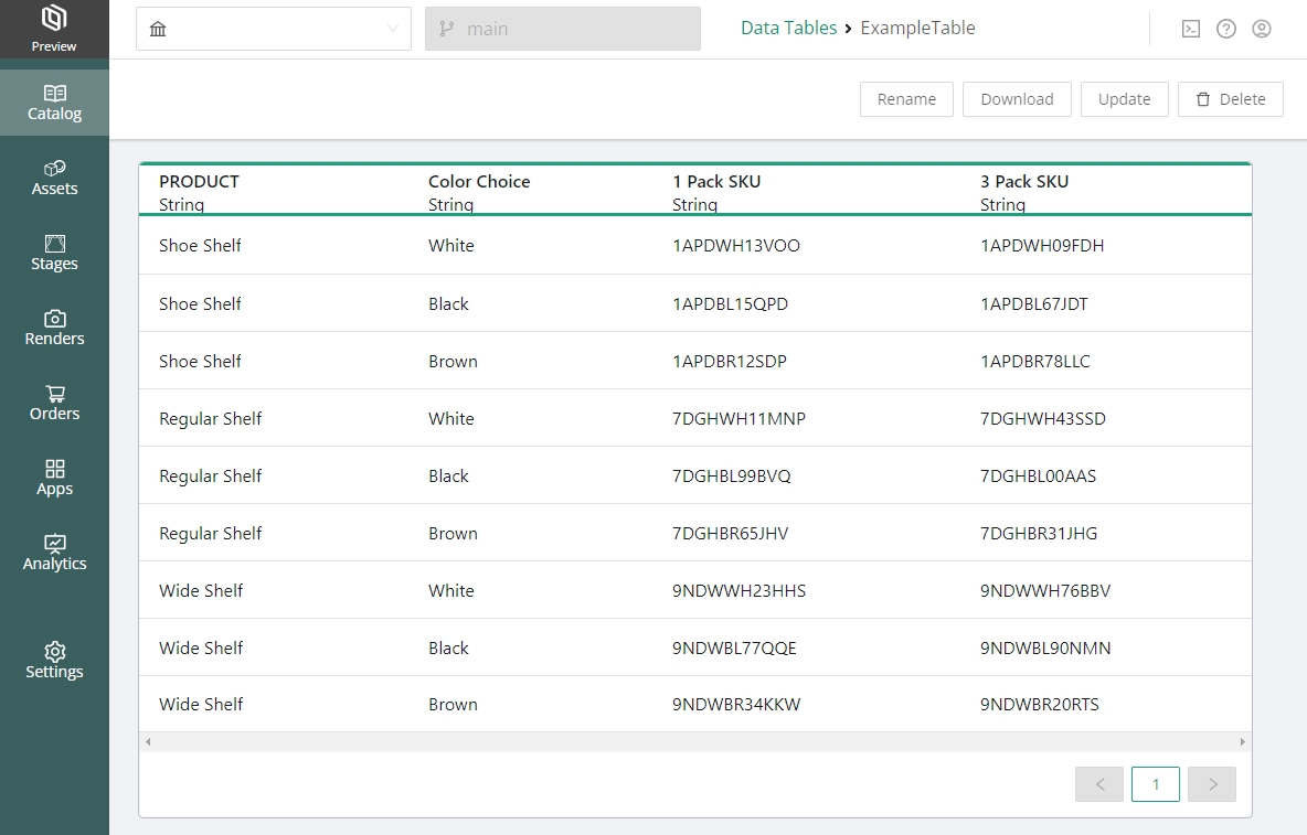 Here is an example of a data table representing the SKUs for these shelving components. The data table shows the different SKUs for these various options depending on shelf type and color choice.
