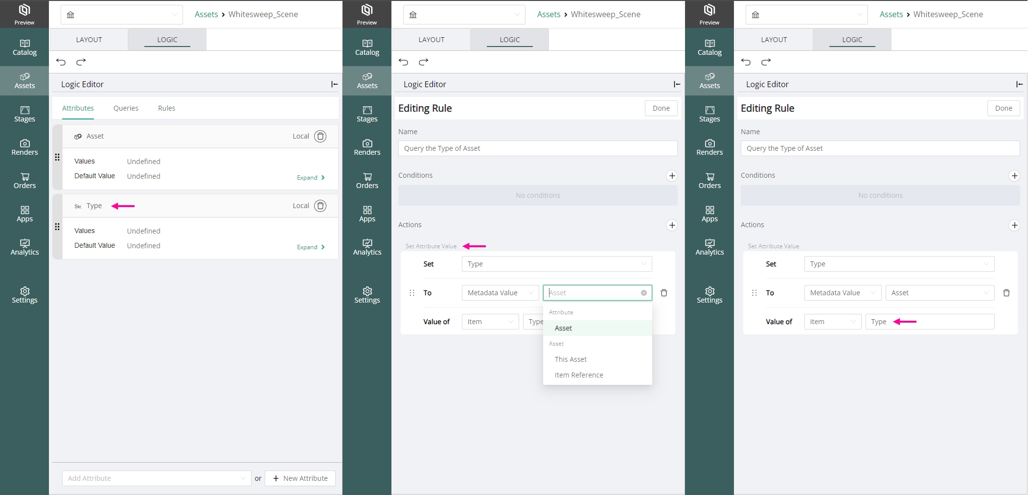 Asset - search for the metadata field named Type on the Asset referenced by the Item passed through the attribute Asset. In this case, it would search for metadata on the JaneSofa model or the AubreyChair model.