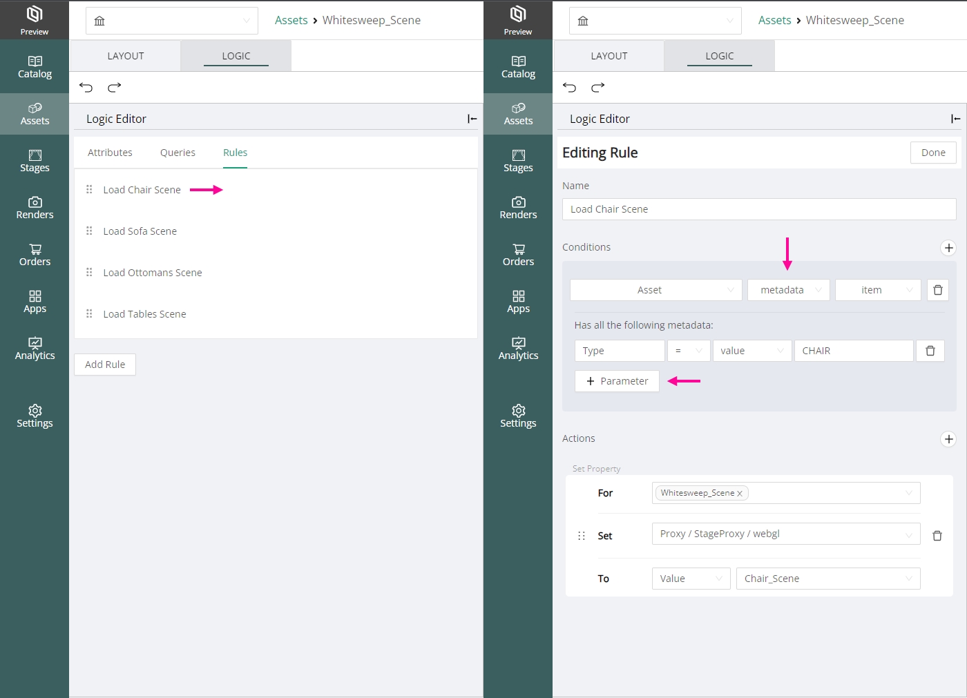 Inside the Proxy Scene asset we would add rules to check for the value of the Type metadata field on the item passed through the Asset attribute.