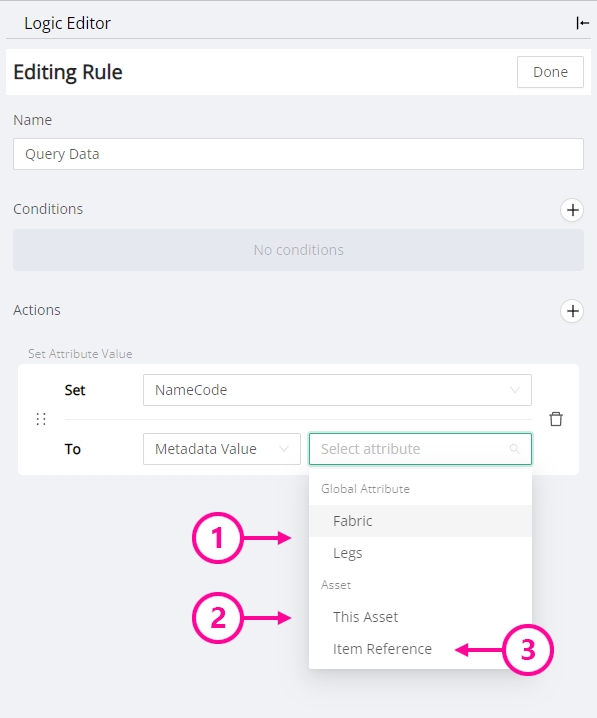 The item or asset passed through one of the listed attributes. In the example above we choose the Asset attribute specifically. This option is only available when we have asset-type attributes added to the current asset. If no attributes of type asset are available, you will not see this option at all.