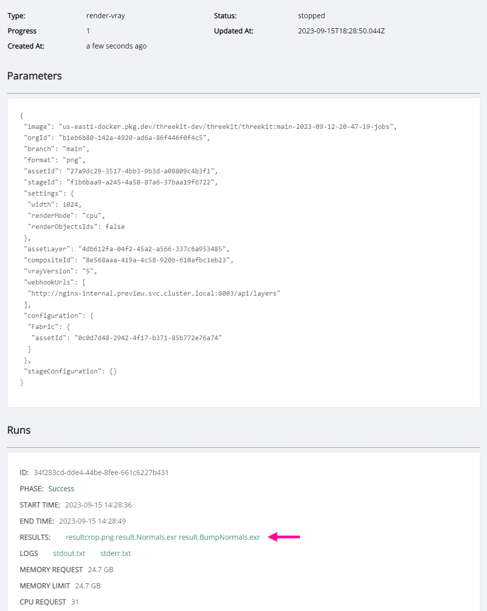 The resulting image from the render will only be available through a download of the render job, or directly from inside each individual render Job Task.