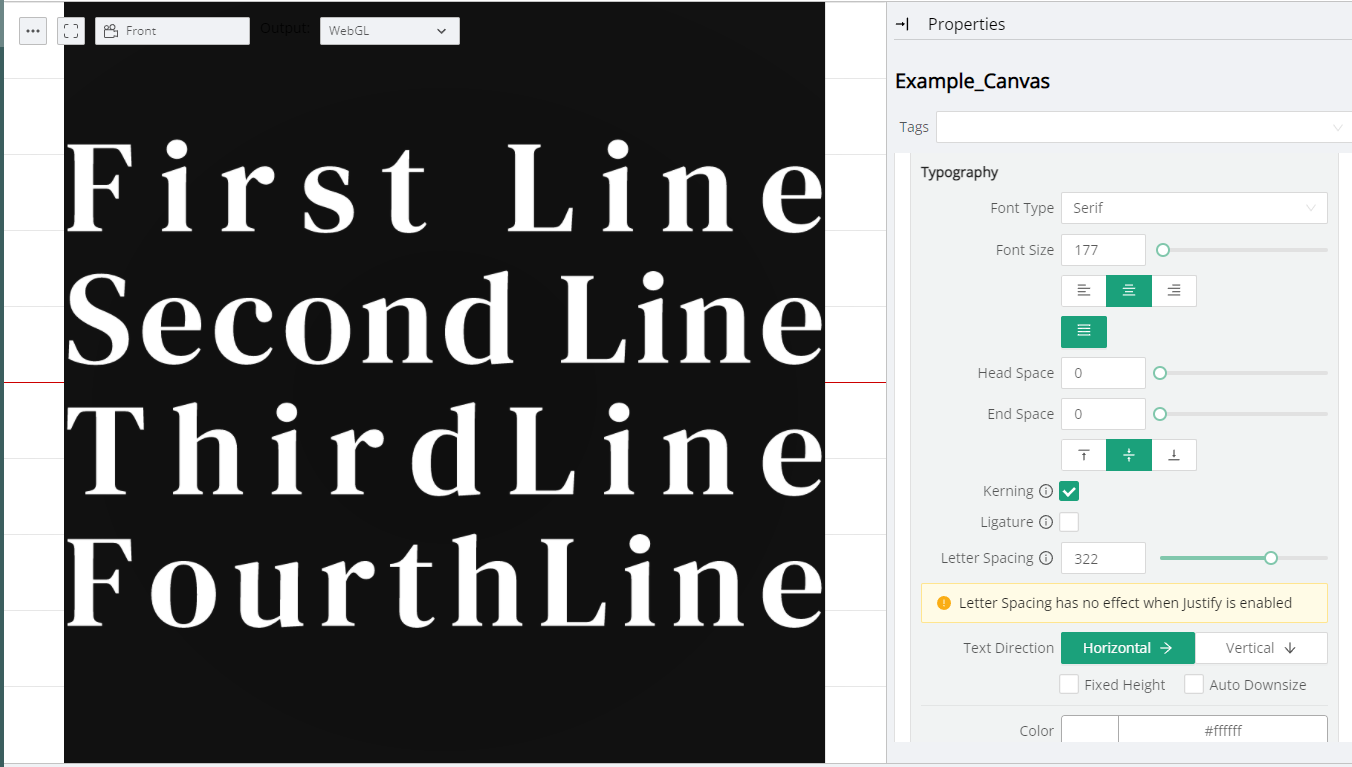 There is also an option to justify the text to fit within the whole Canvas. This will apply the justification depending on the Text Direction property (ie. if the Text Direction is set to Horizontal, then the justification will be applied horizontally only).