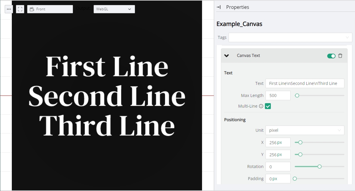 If the Canvas is 512x512 pixels in size, then using Pixel Unit mode we would have to position the Canvas Text at 256x256 pixels on the X and Y properties, if the Typography is set to Center and Middle Justification.