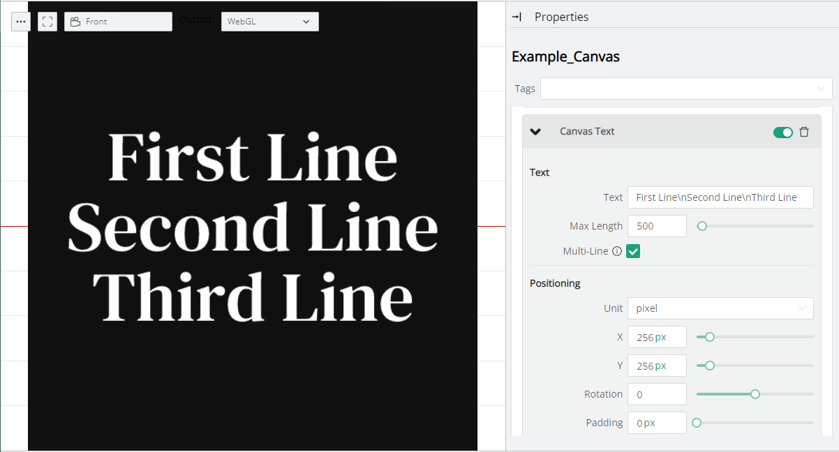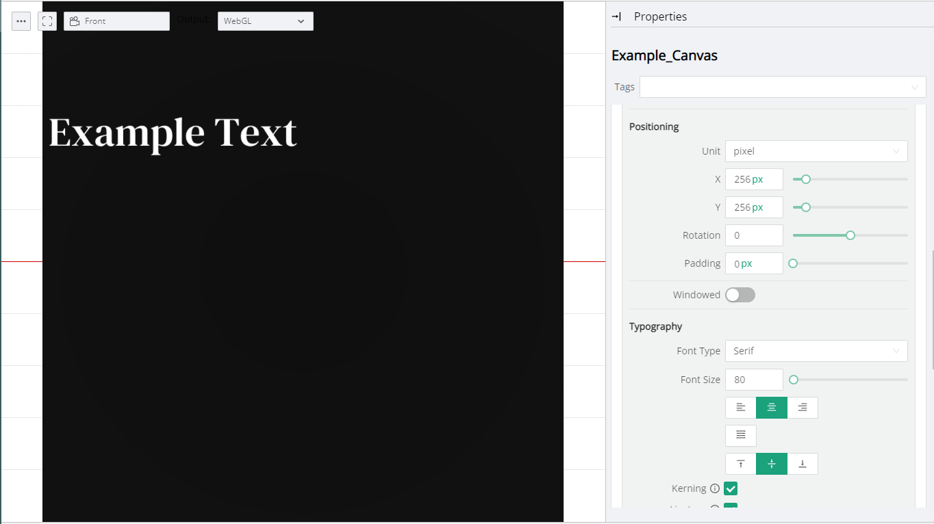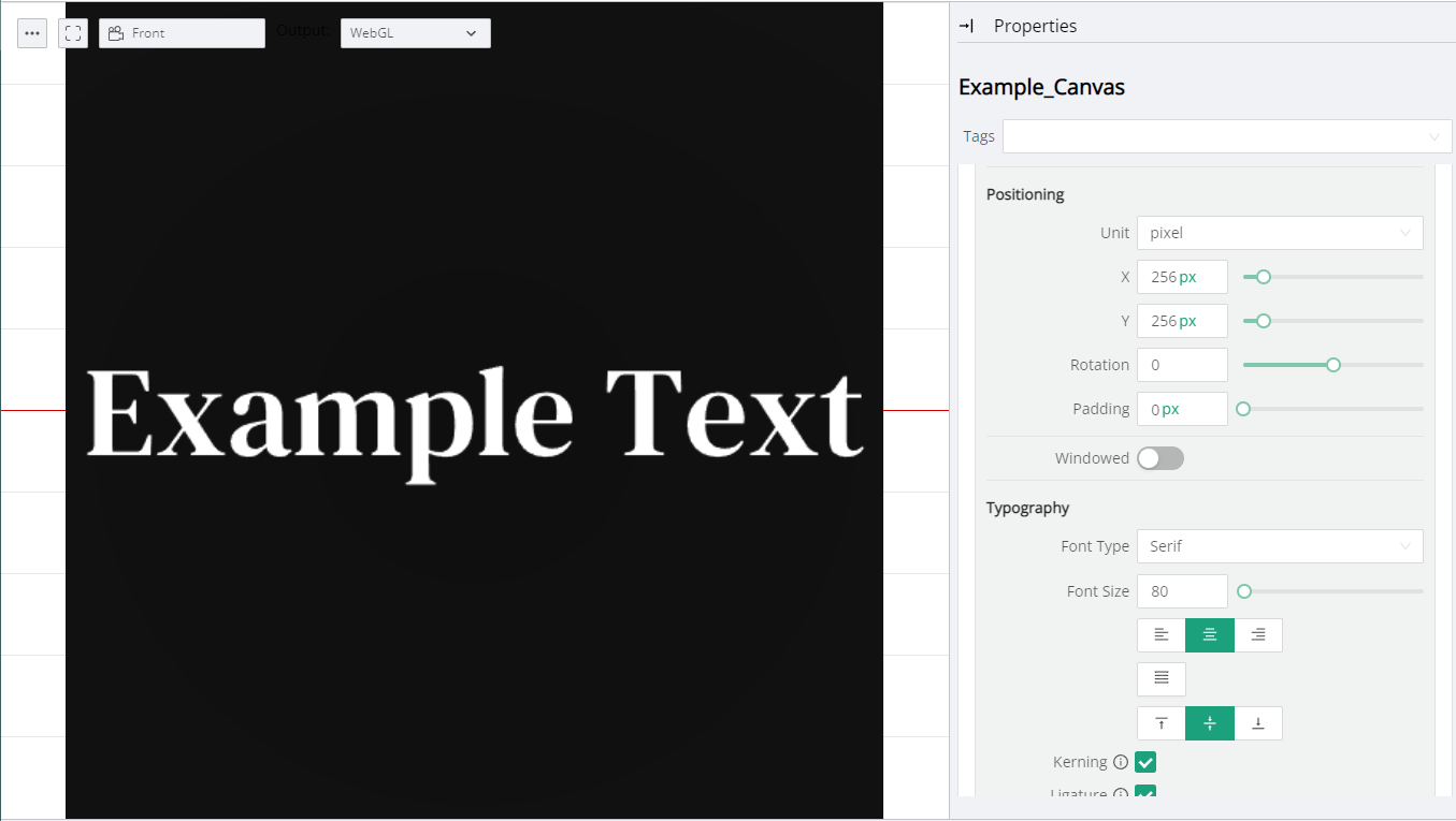 If the Canvas is 512x512 pixels in size, then using **Pixel Unit** mode we would have to position the Canvas Text at 256x256 pixels on the X and Y properties, if the Typography is set to Center and Middle Justification.&#x20;