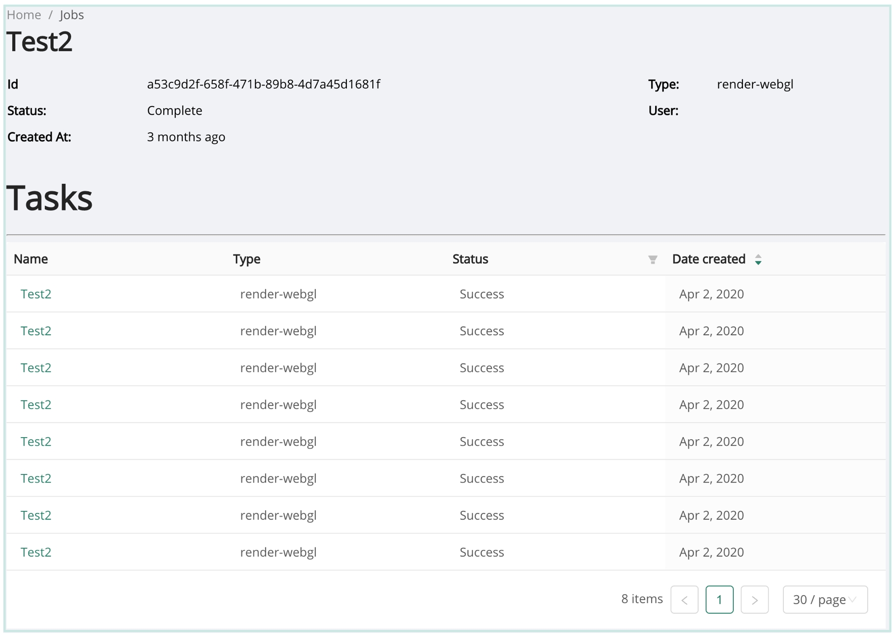 Upon hitting render, the user is re-directed to a page specific to the render job. The user may filter based on Status as well as access information on each of the individual renders.