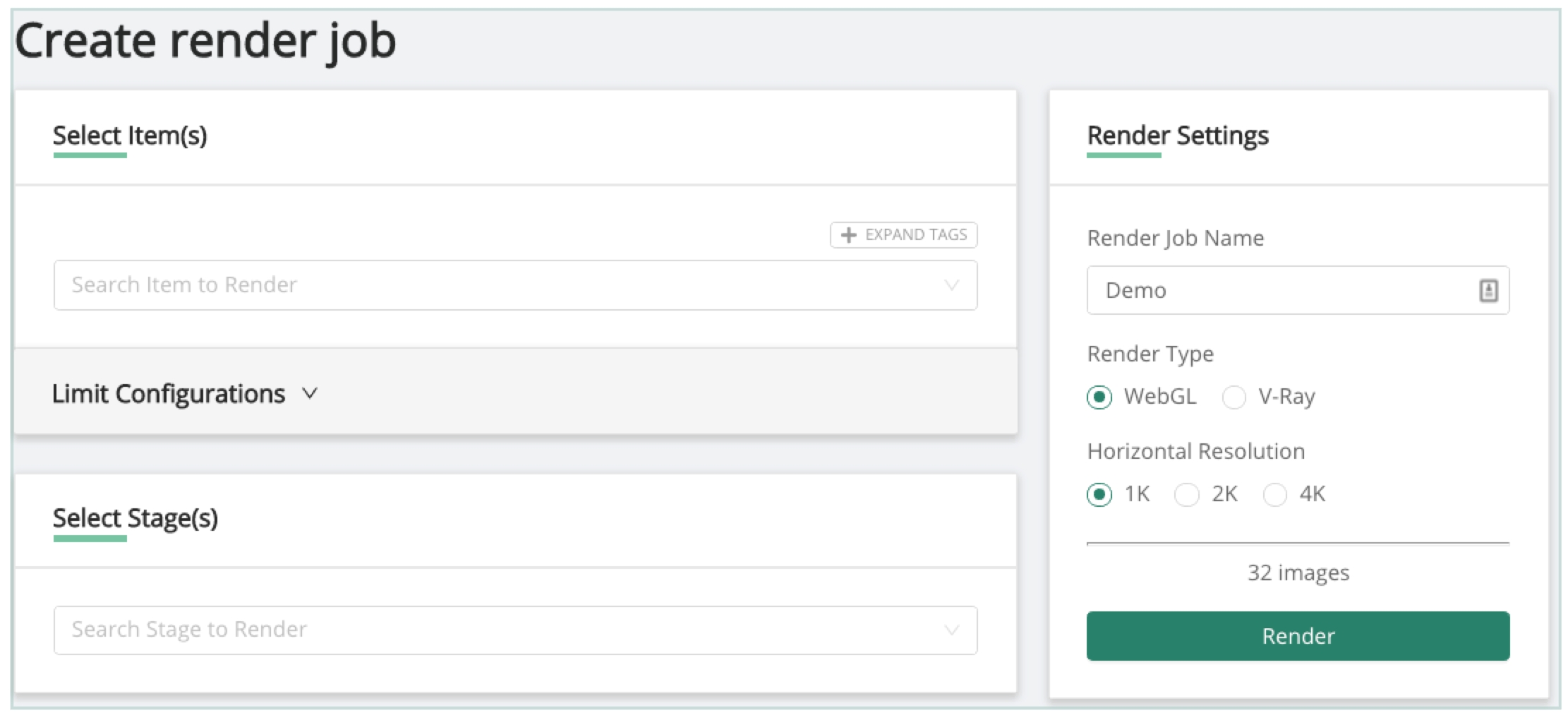 On the Create Render Job interface, the Item from which you hit the button should appear by default in the Select Item field. Select a Stage, then provide a meaningful name. Feel free to limit the renders by hitting the Limit Configurations button. Select the desired Render Type and Resolution, then hit Render.
