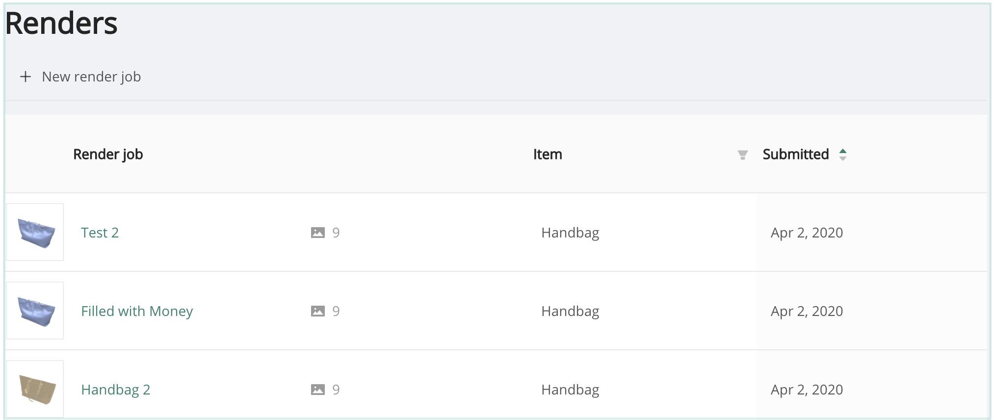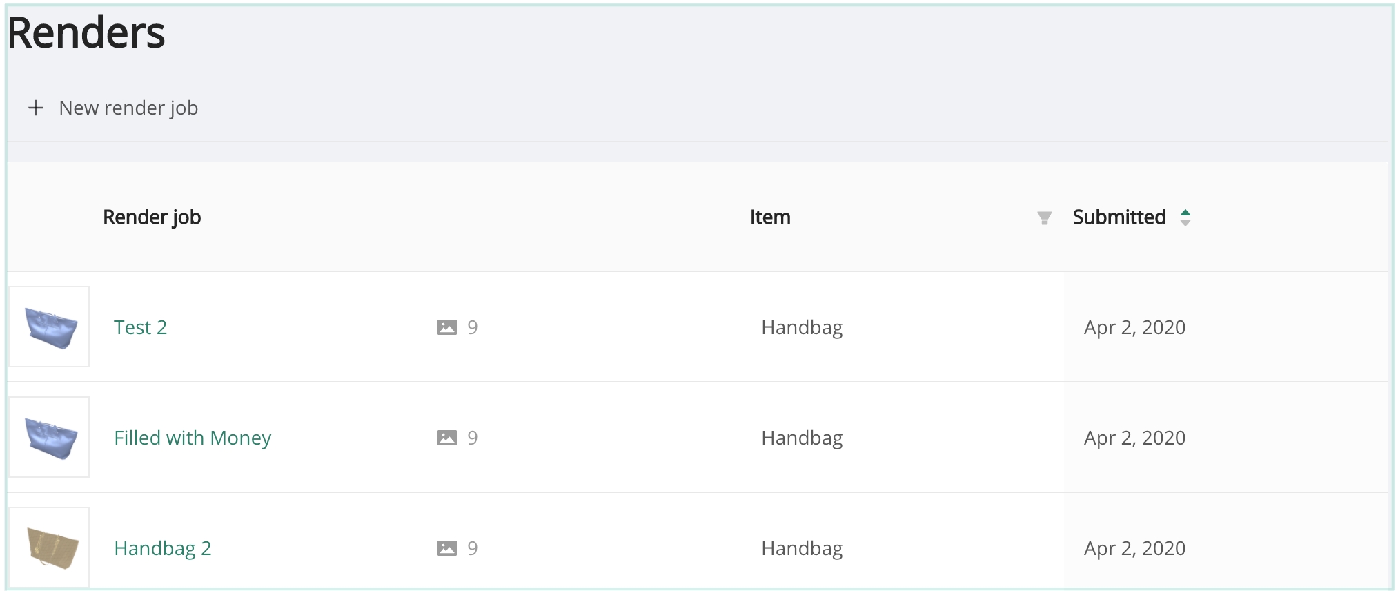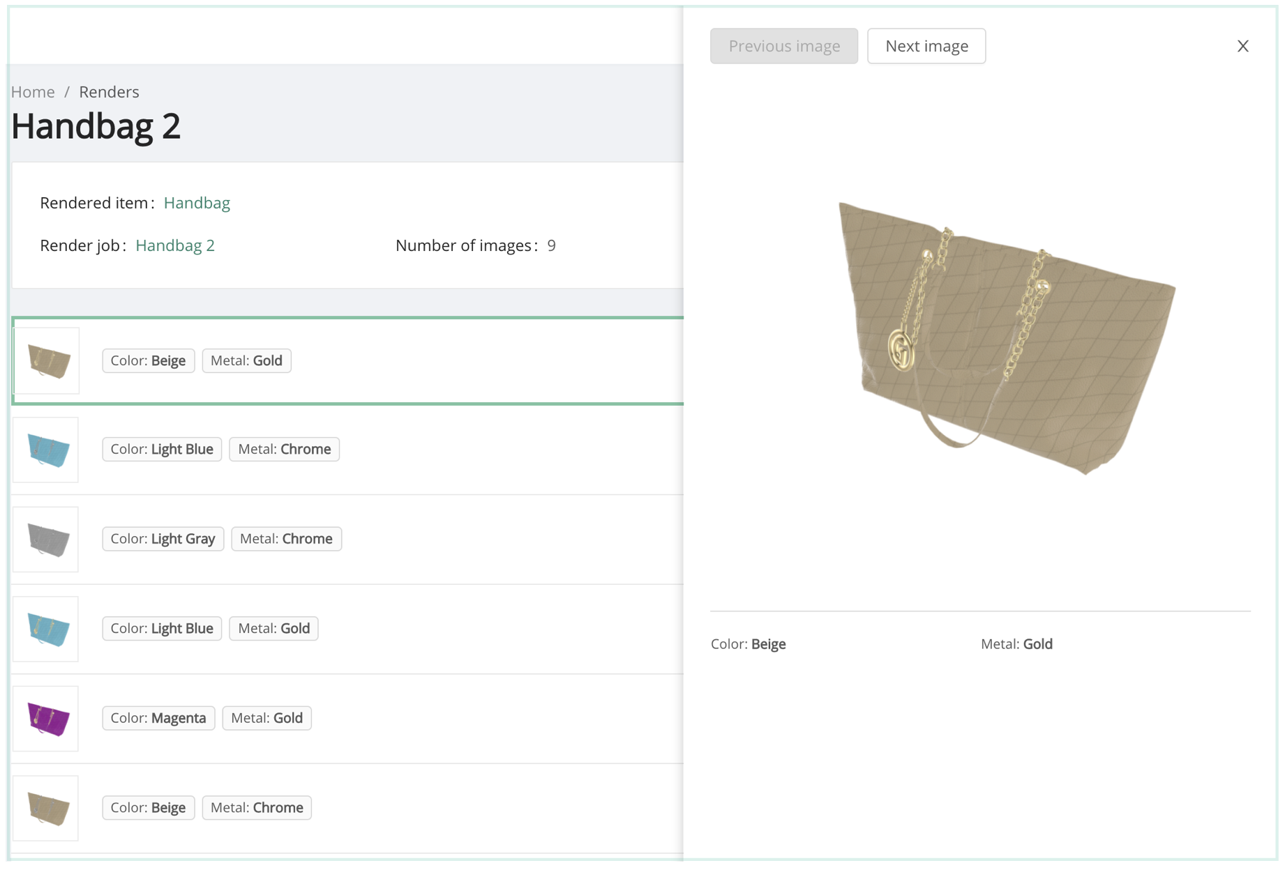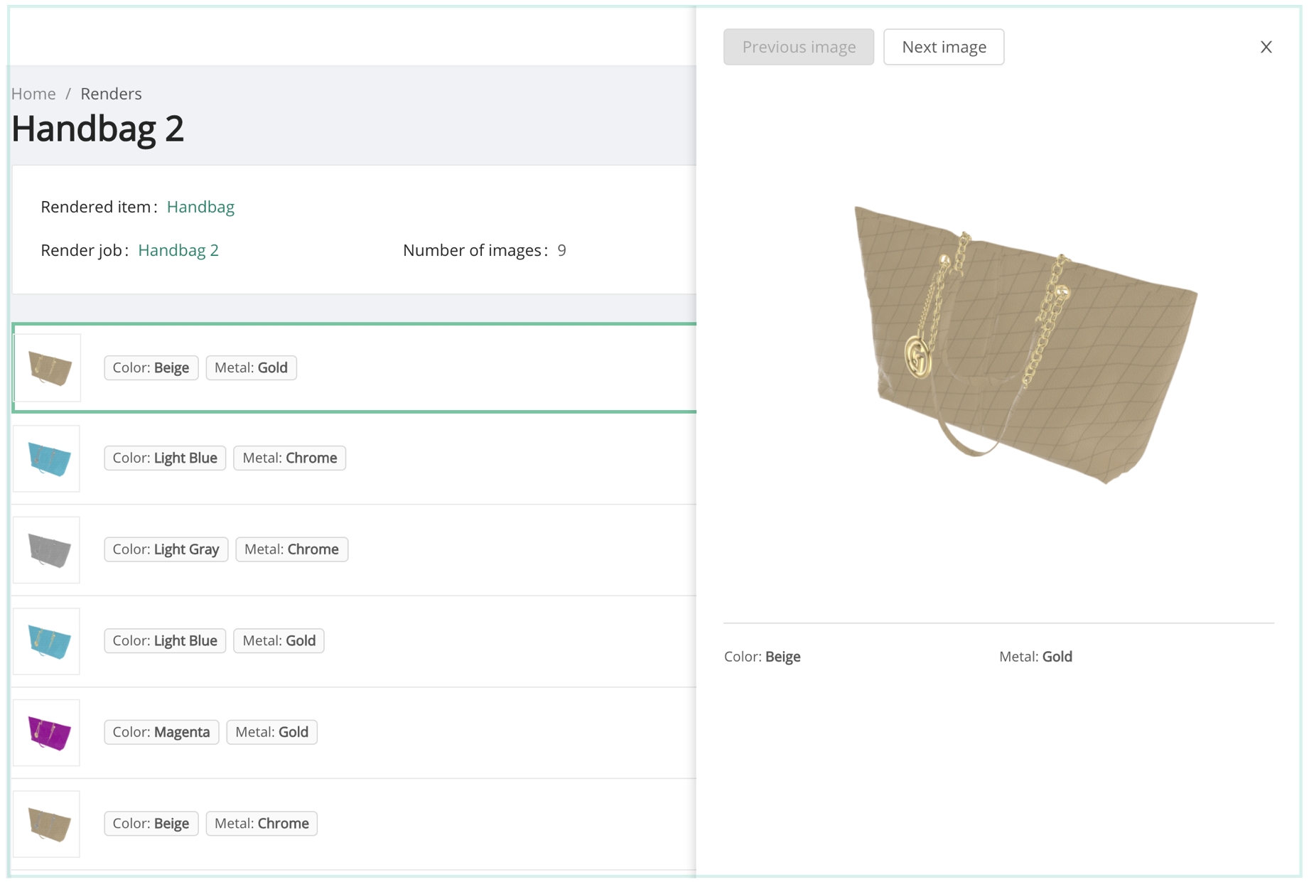 The Renders tab will provide a listing of all render jobs. To preview the renders, click any render job record, then click on any individual render to present a preview panel.