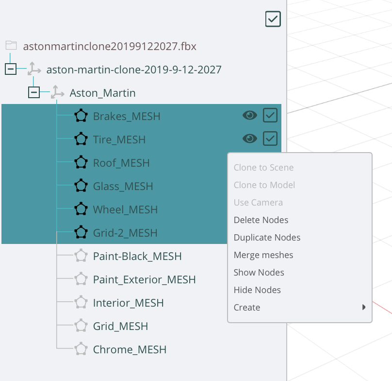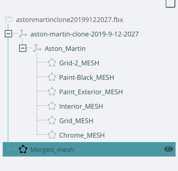 Meshes can now be merged in the Editor to simplify asset node structures. Nodes can be multi-selected using `shift` + `click`. Right click and select the `Merge meshes`.<br>