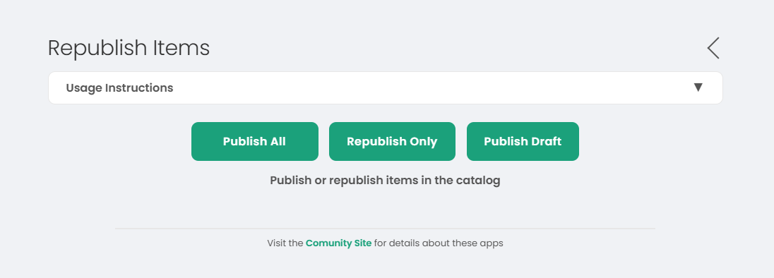 The platform UI does not currently allow us to apply changes in bulk to the entire catalog or search results across multiple pages. You can therefore use this app to publish all items or republish the already published items in the catalog.